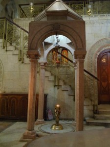 В Храме Гроба Господня к западу от Камня Помазания, примерно в 12 м от него, расположен мраморный квадратный киворий.