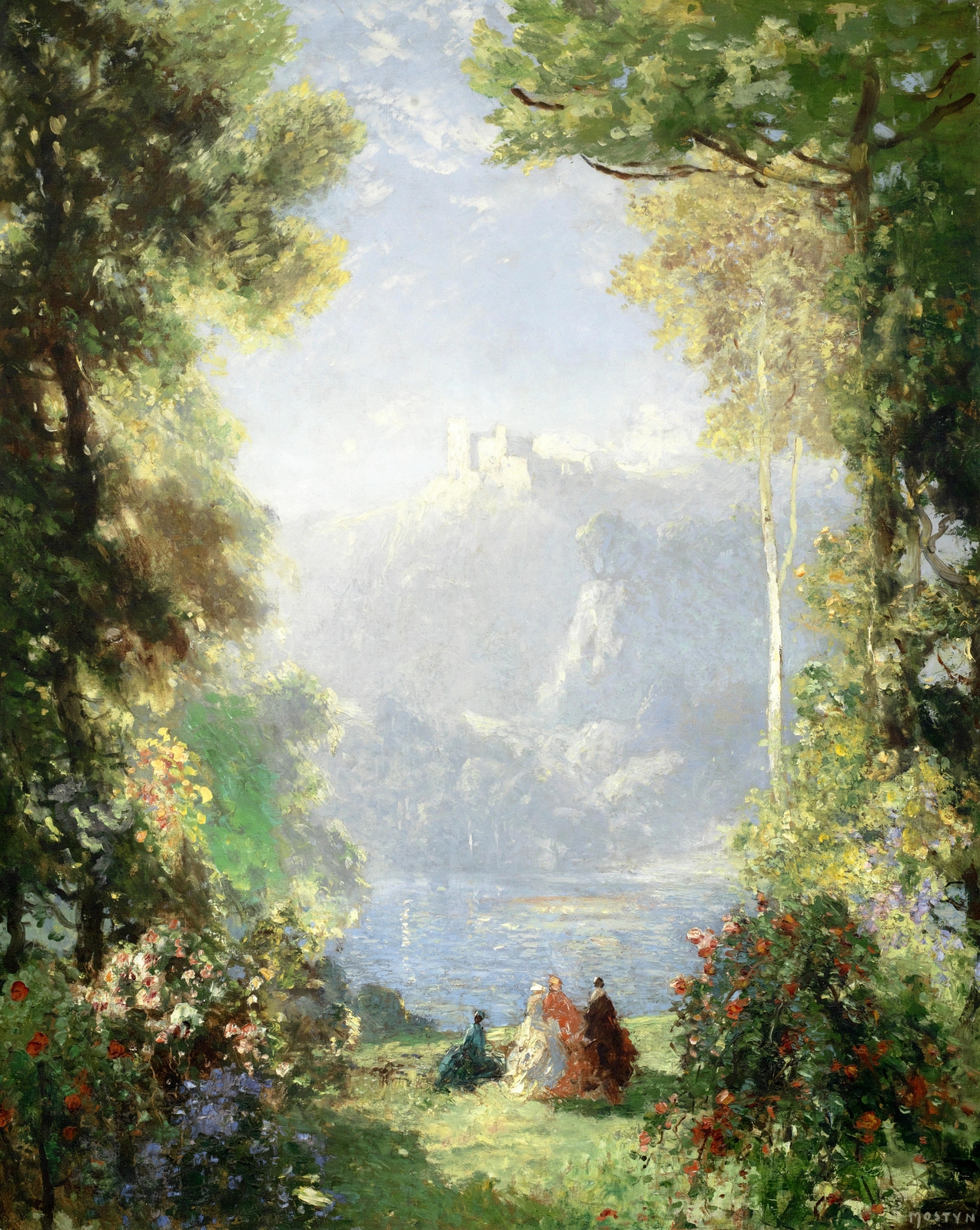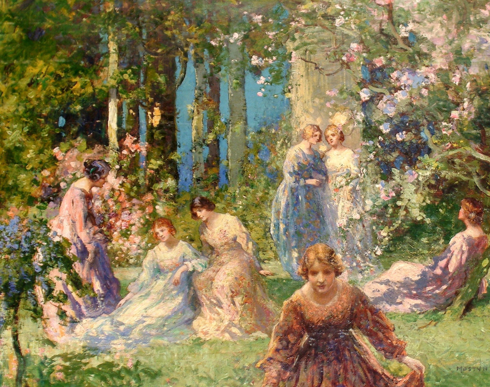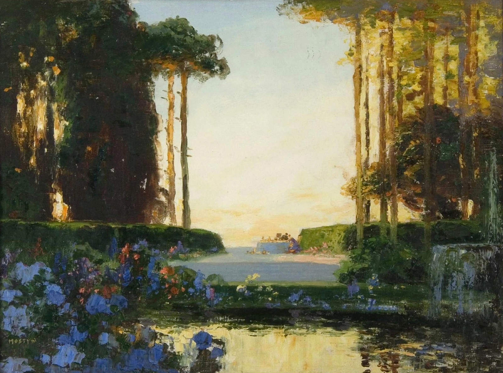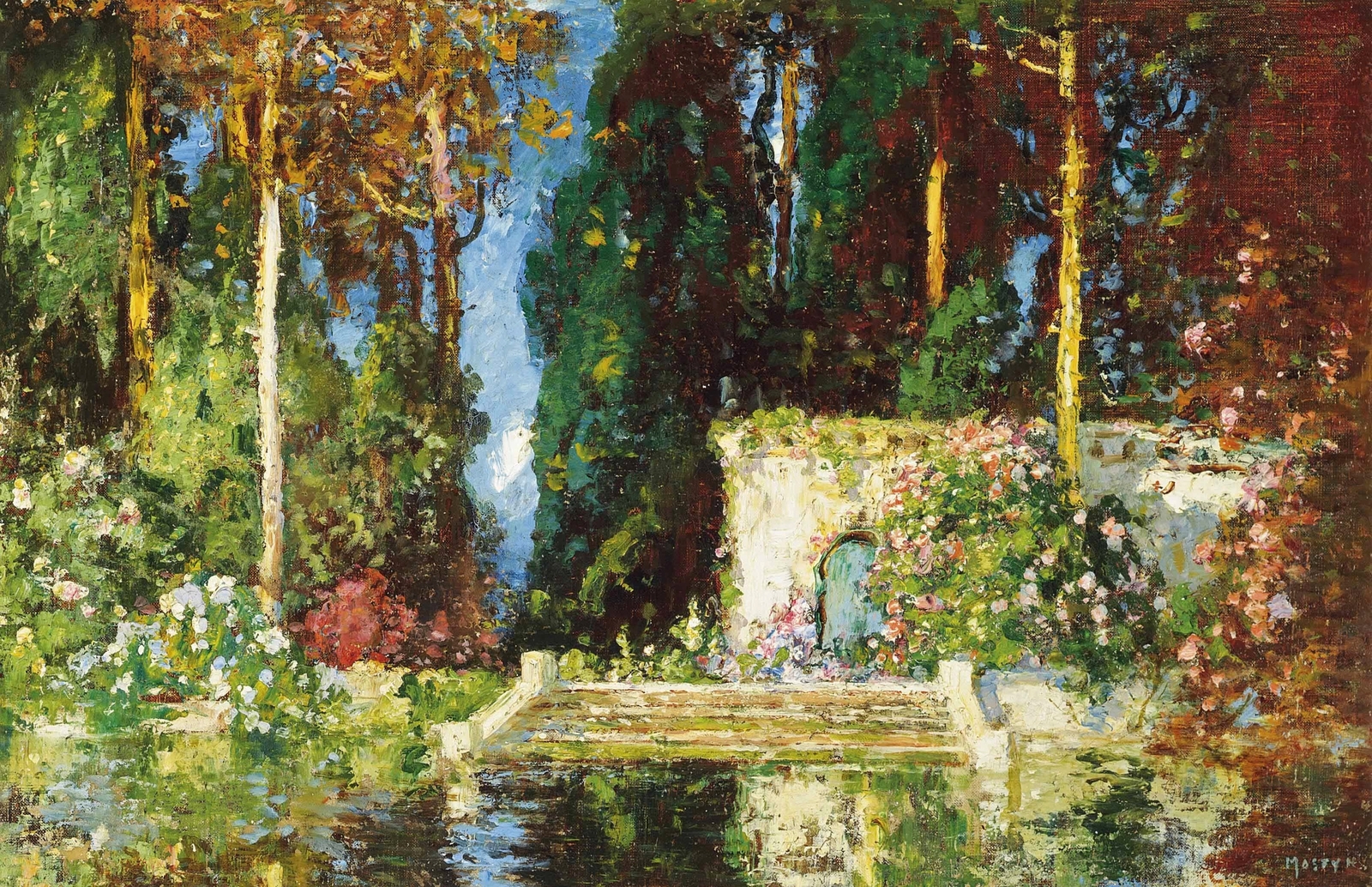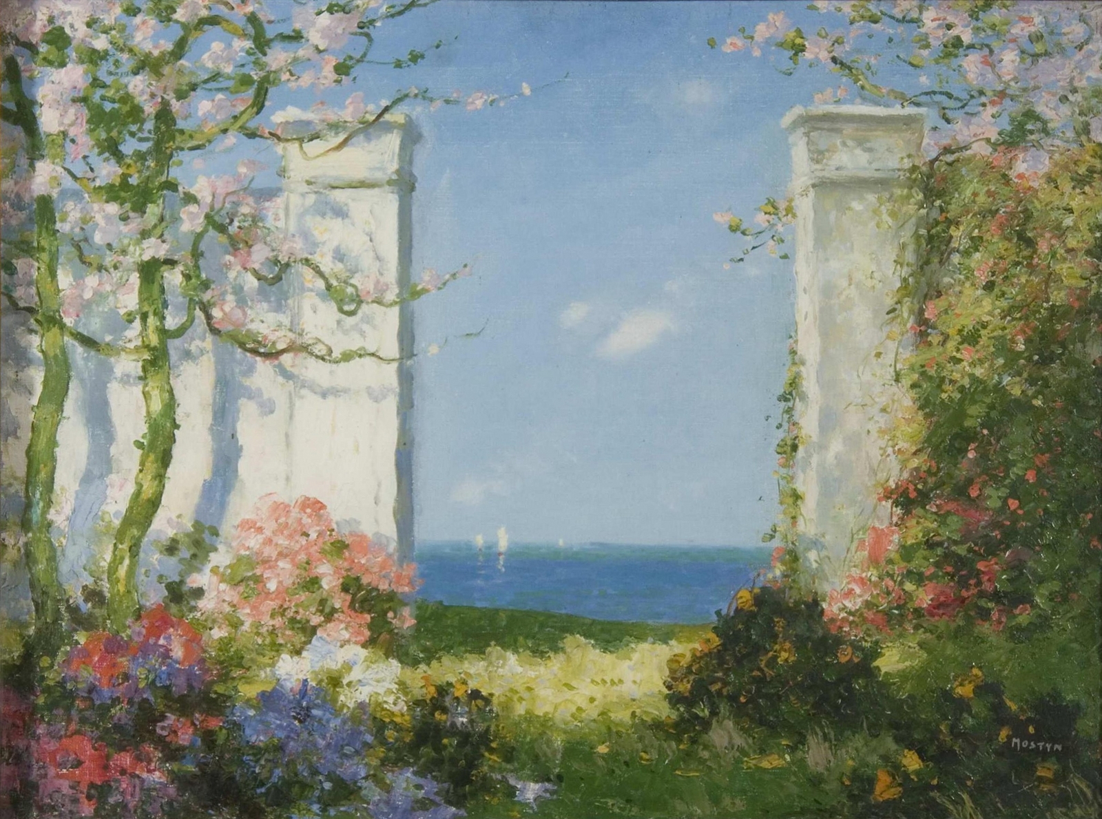 Томас Эдвин Мостин (Thomas Edwin Mostyn; 1864-1930) – автор портретов, натюрмортов и удивительных пейзажей, пронизанных ярким солнечным светом, который освещает сказочные ландшафты. Густые сады, сапфировое южное небо, яркие грозди цветов и загадочные женские фигуры, одиноко гуляющие по паркам или созерцающие воздушные замки и сами эфемерные, не имеющие индивидуальных черт. И всё на картине полупризрачно, как мимолетная грёза – формы расплывчаты, колеблются и плавятся, оставляя в душе лишь впечатление, что ты соприкоснулся с прекрасным таинственным миром.