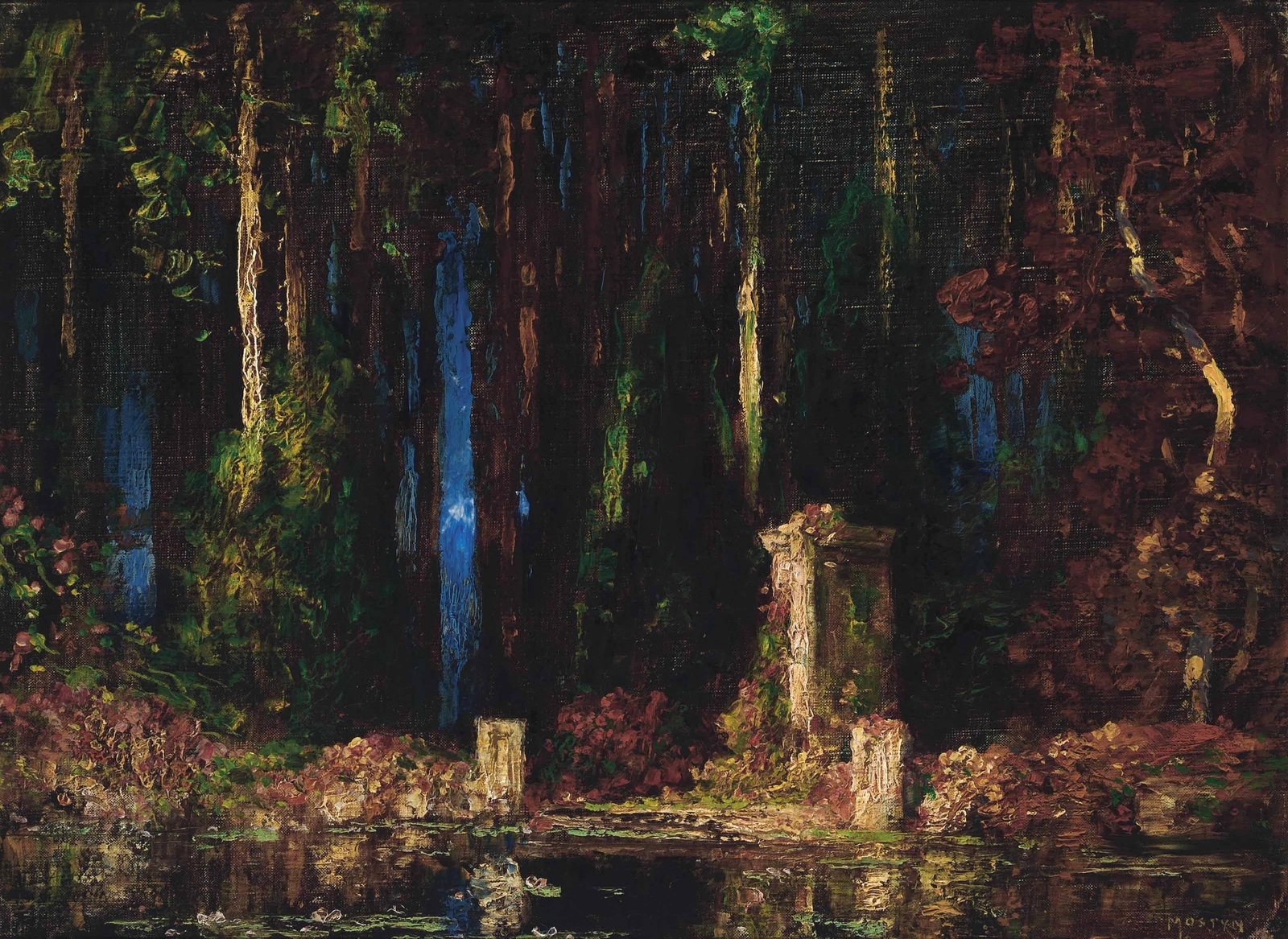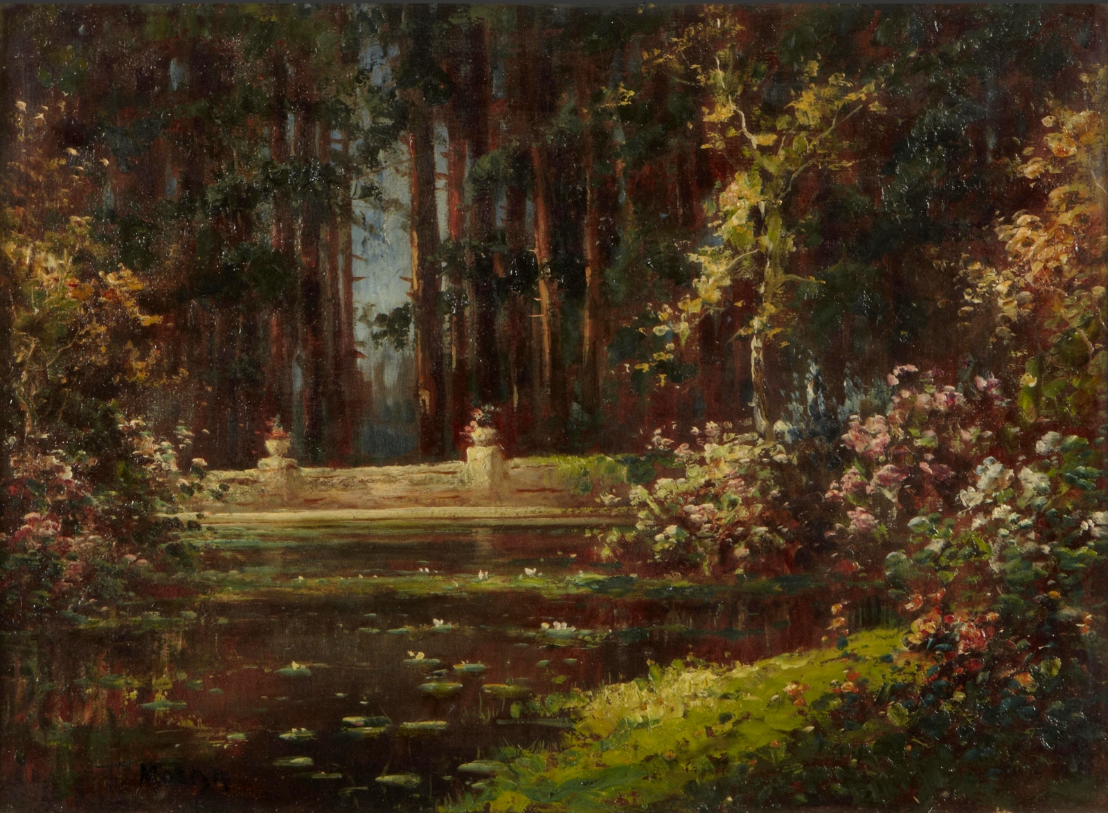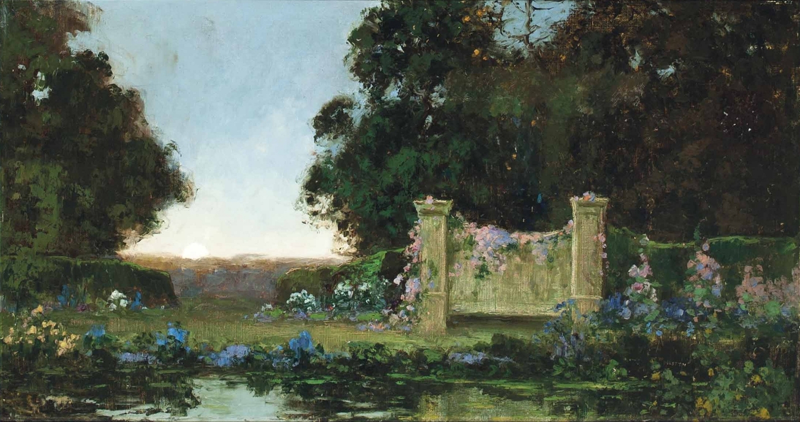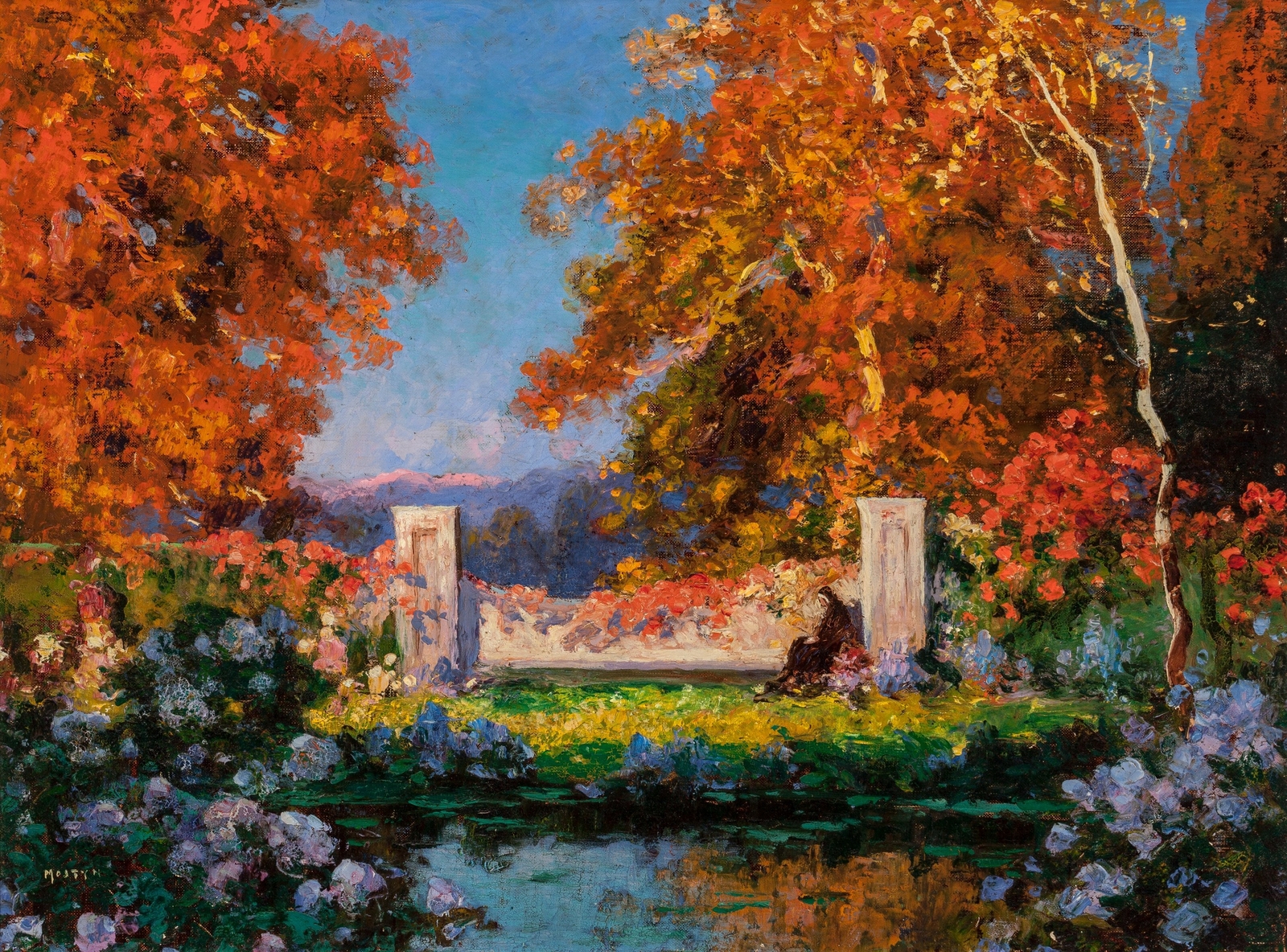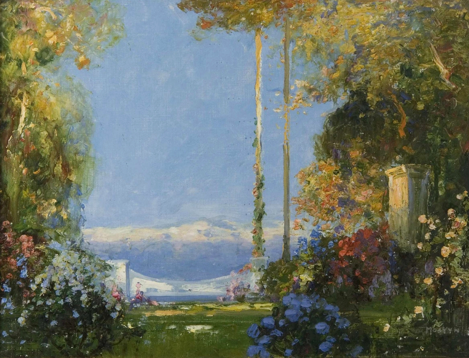 Томас Эдвин Мостин (Thomas Edwin Mostyn; 1864-1930) – автор портретов, натюрмортов и удивительных пейзажей, пронизанных ярким солнечным светом, который освещает сказочные ландшафты. Густые сады, сапфировое южное небо, яркие грозди цветов и загадочные женские фигуры, одиноко гуляющие по паркам или созерцающие воздушные замки и сами эфемерные, не имеющие индивидуальных черт. И всё на картине полупризрачно, как мимолетная грёза – формы расплывчаты, колеблются и плавятся, оставляя в душе лишь впечатление, что ты соприкоснулся с прекрасным таинственным миром.