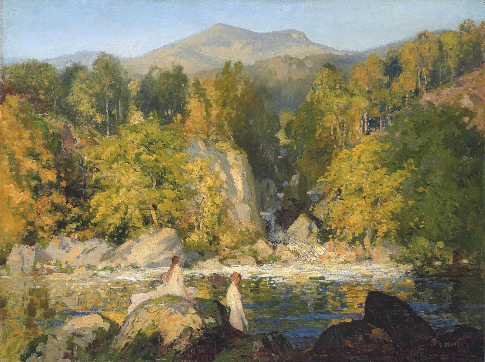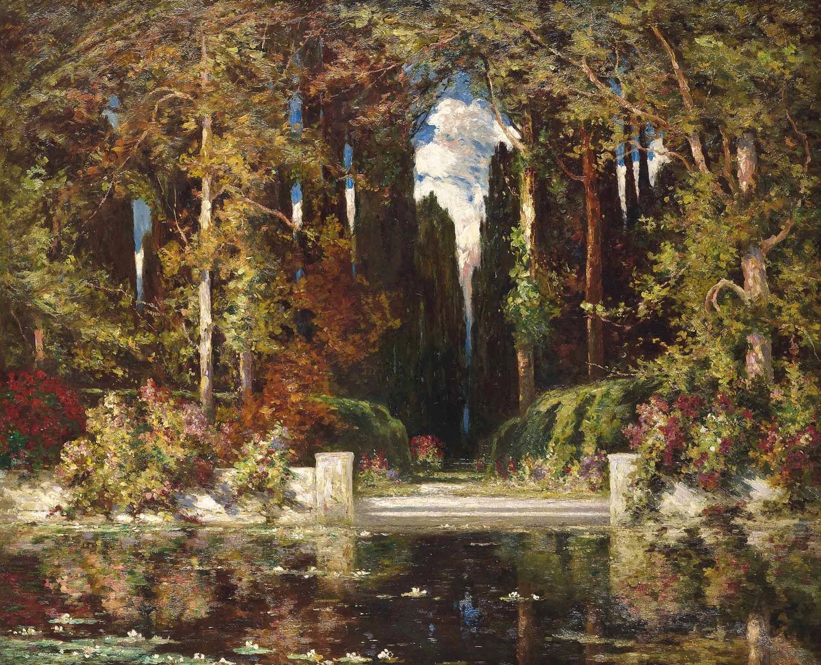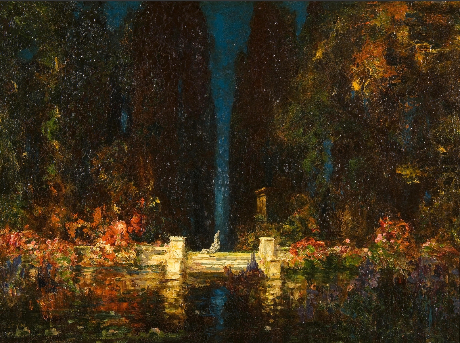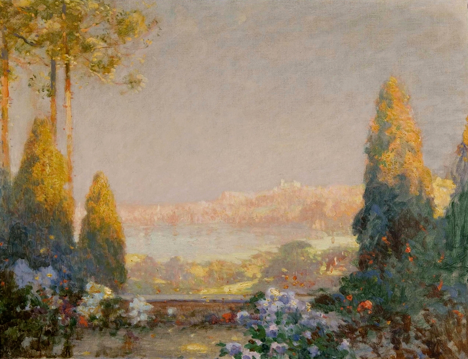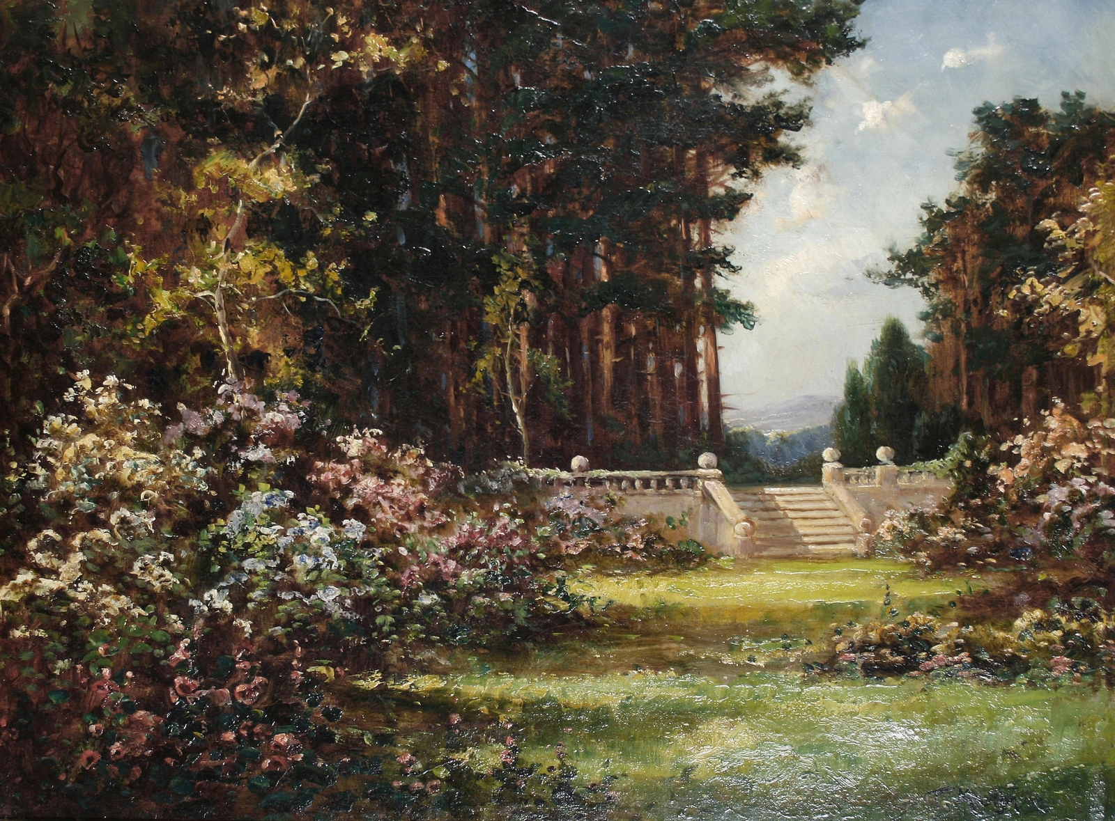 Томас Эдвин Мостин (Thomas Edwin Mostyn; 1864-1930) – автор портретов, натюрмортов и удивительных пейзажей, пронизанных ярким солнечным светом, который освещает сказочные ландшафты. Густые сады, сапфировое южное небо, яркие грозди цветов и загадочные женские фигуры, одиноко гуляющие по паркам или созерцающие воздушные замки и сами эфемерные, не имеющие индивидуальных черт. И всё на картине полупризрачно, как мимолетная грёза – формы расплывчаты, колеблются и плавятся, оставляя в душе лишь впечатление, что ты соприкоснулся с прекрасным таинственным миром.